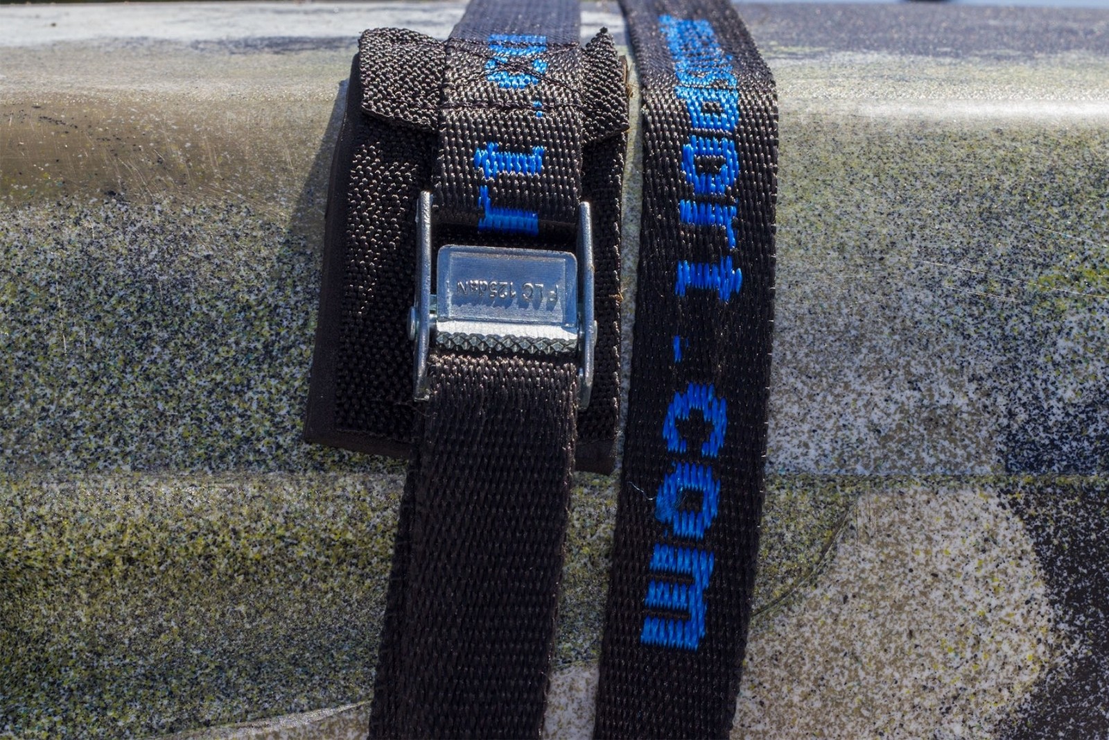 Pasy posiadają specjalną gumową podkładkę (5mm grubości), która zabezpiecza kajak przed zarysowaniem/uszkodzeniem podczas wiązania i luzowania zaciśniętego pasa.