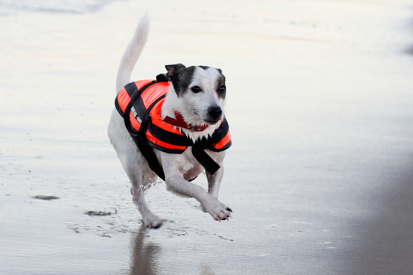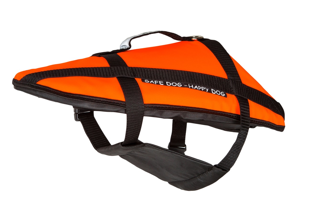 Kamizelka asekuracyjna dla psa, wspomagająca pływanie. Zapinana na trzy klamry z regulacją długości pasów. Dobrą widoczność psa na tle wody zapewnia jaskrawy, pomarańczowy kolor i taśma odblaskowa SOLAS.